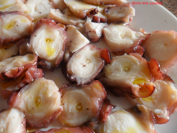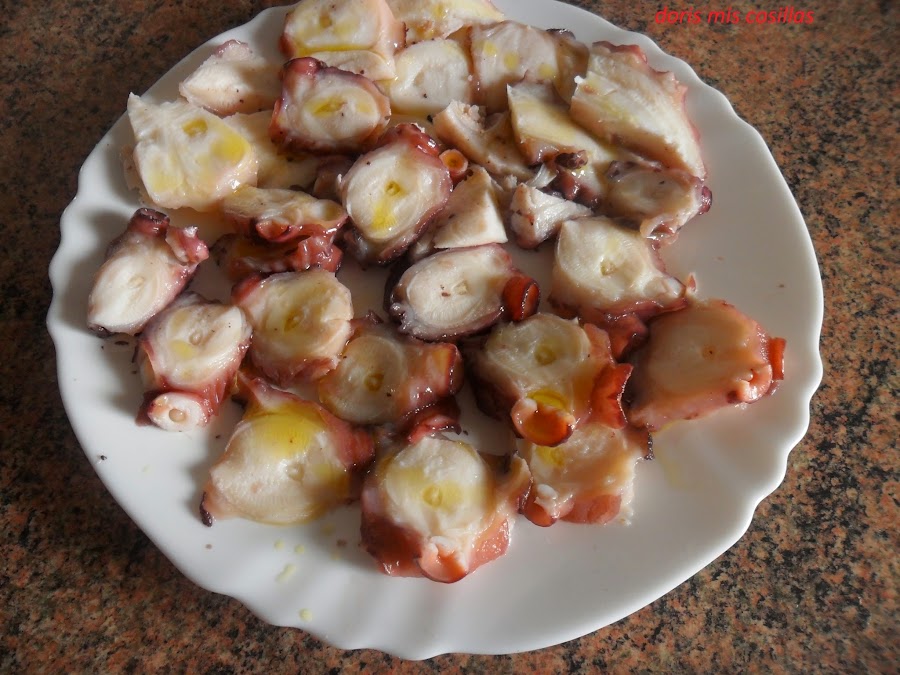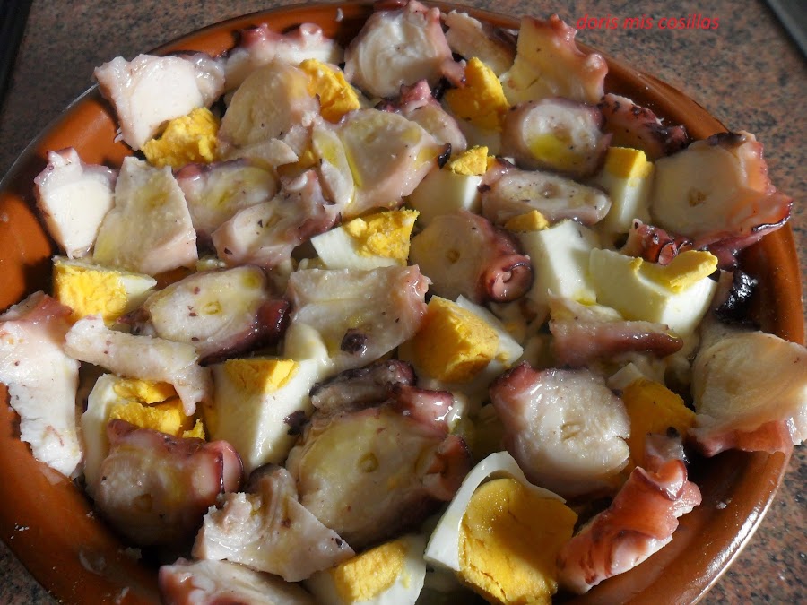 Por otro lado ya tenemos cocido el pulpo en seco, pincha aquí para ver como yo lo preparo. lo cortamos a rodajas no muy gruesas, añadimos un poco de aceite de oliva virgen extra para que no se seque.Por otro lado, cocer los dos huevos, pelamos en frío y cortamos en cuartos.Reservamos en la nevera.