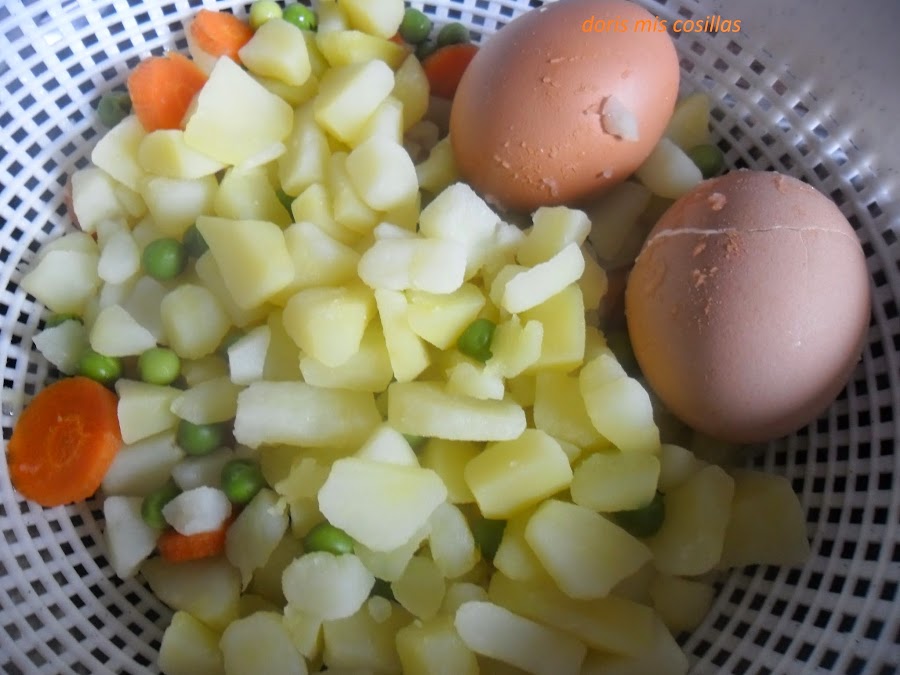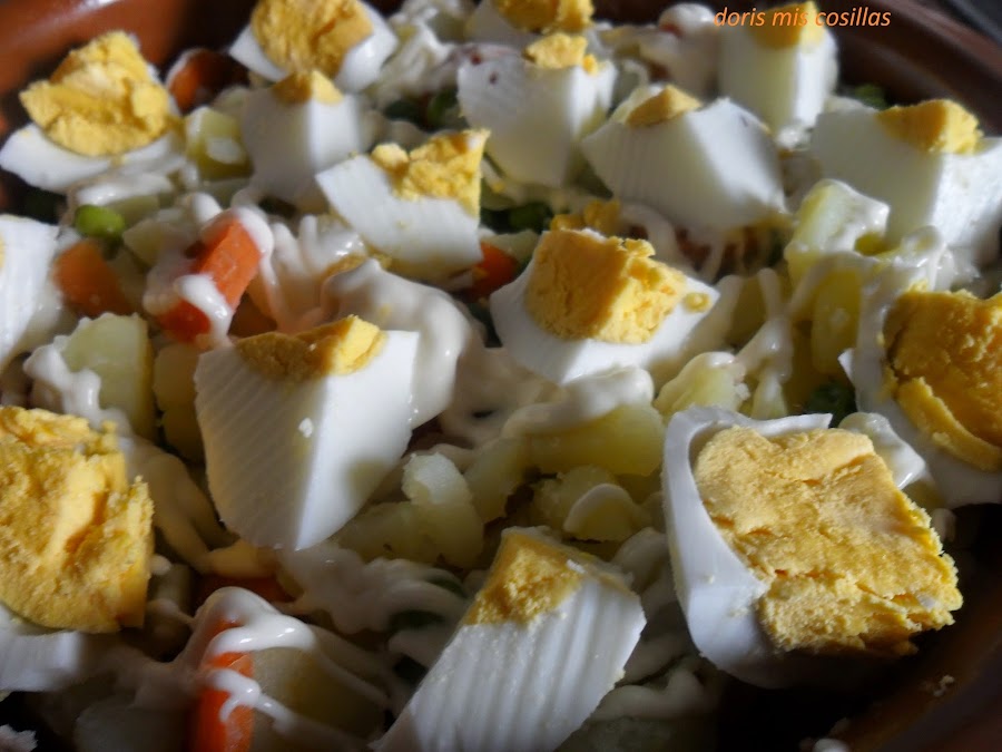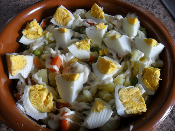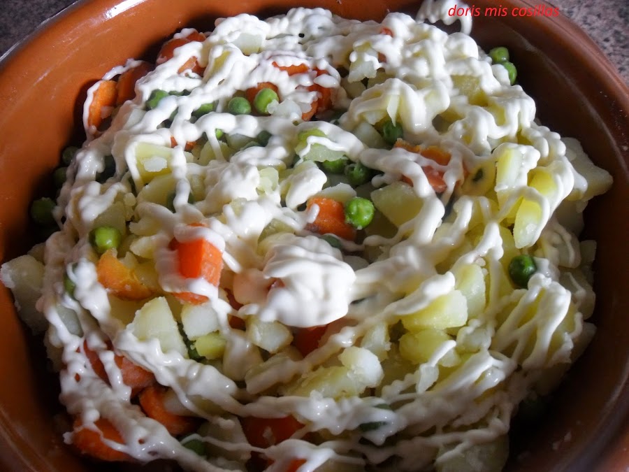 En una cazuela de barro o de cristal, poner una capa de ensaladilla fría, aliñamos con una generosa capa de mayonesa.