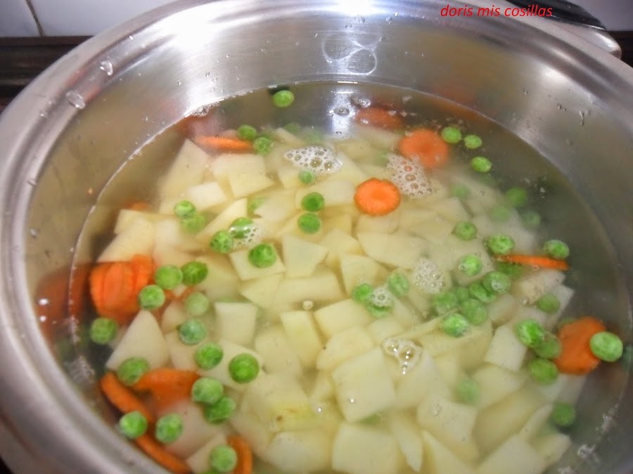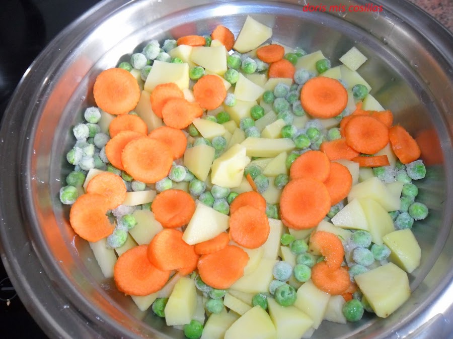 Pelamos y cortamos, 4 patatas a cuadritos, zanahoria a rodajas y un puñado de guisantes congelados.
