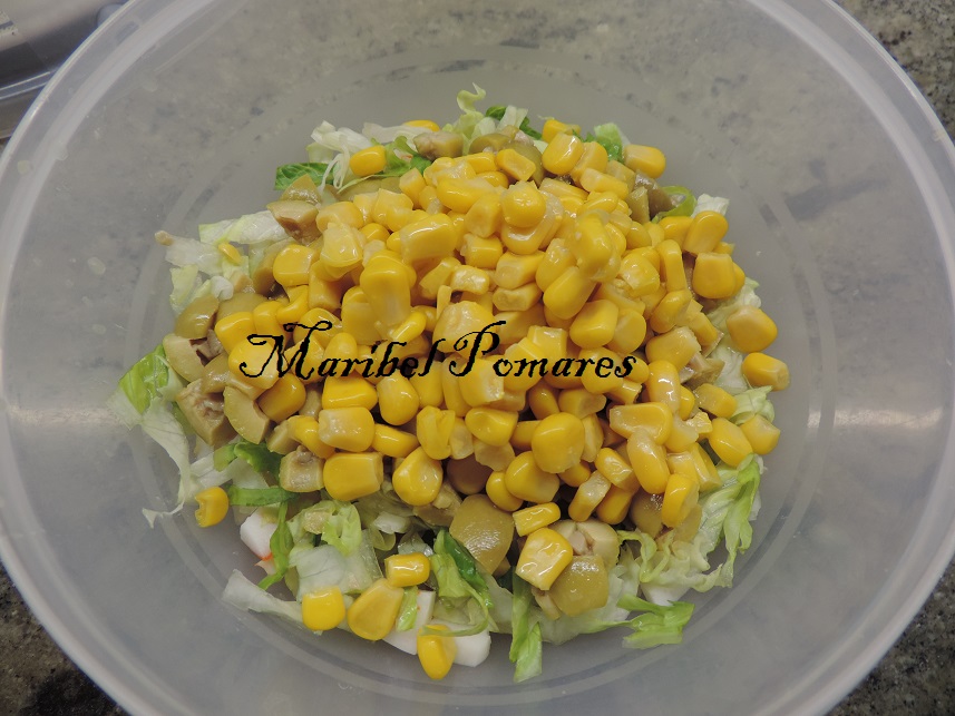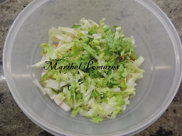 Cortamos la lechuga en juliana muy fina y la añadimos al surimi.