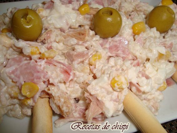 Cuando esté totalmente escurrido poner en un bol junto con los demas ingredientes cortado en daditos, el atún bien escurrido de aceite y desmenuzado, añadir el maiz y finalmente la mayonesa.