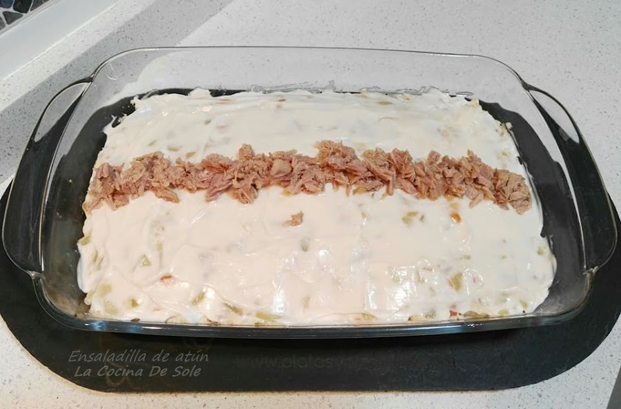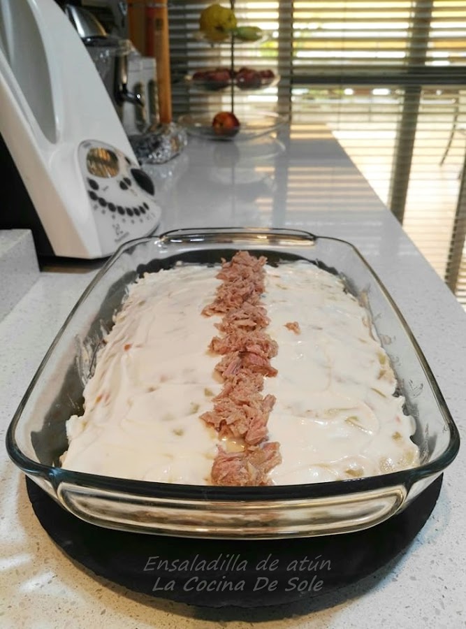 Lo pasamos a la fuente donde vayamos a presentarlo, la cubrimos con mahonesa.