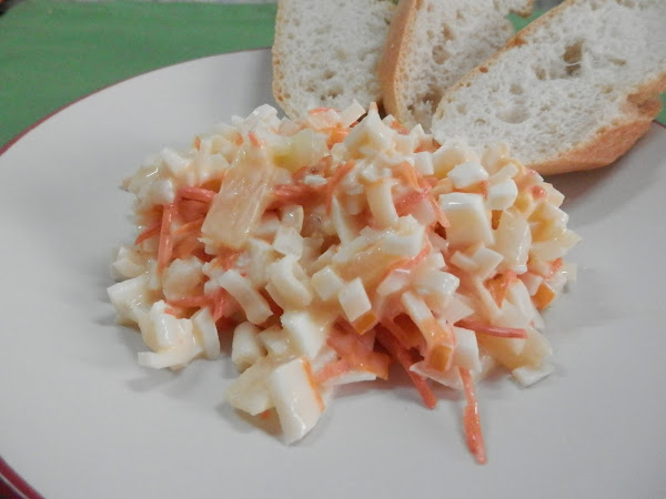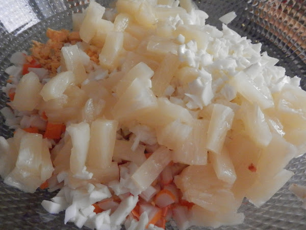 En un bol añadimos los palitos de cangrejo, el huevo picado, la zanahoria,la cebolla, la piña y la mayonesa.