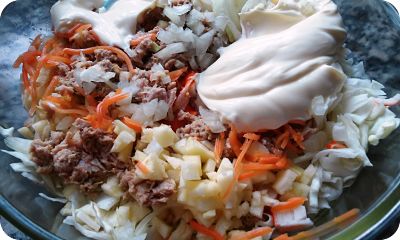 Pica pequeñito la col ( sin cocer, debe estar cruda ), cebolla, manzana, palitos de cangrejo y 2 huevos duros.