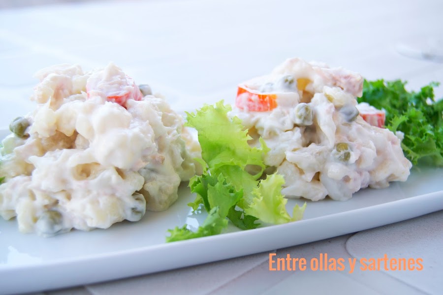 Cortamos los tallos de la coliflor a trocitos y separamos los ramilletes lo más pequeño que podamos. Le añadimos el atún y los guisantes escurridos, el surimi picado y mezclamos con la mahonesa. Dejándolo en la nevera hasta que lo vayamos a consumir.