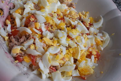 Espera a que se enfríen. Ponlos en una ensaladera grande, añade el atún escurrido de aceite, los huevos duros picados, el pimiento morrón picadito y escurrido.