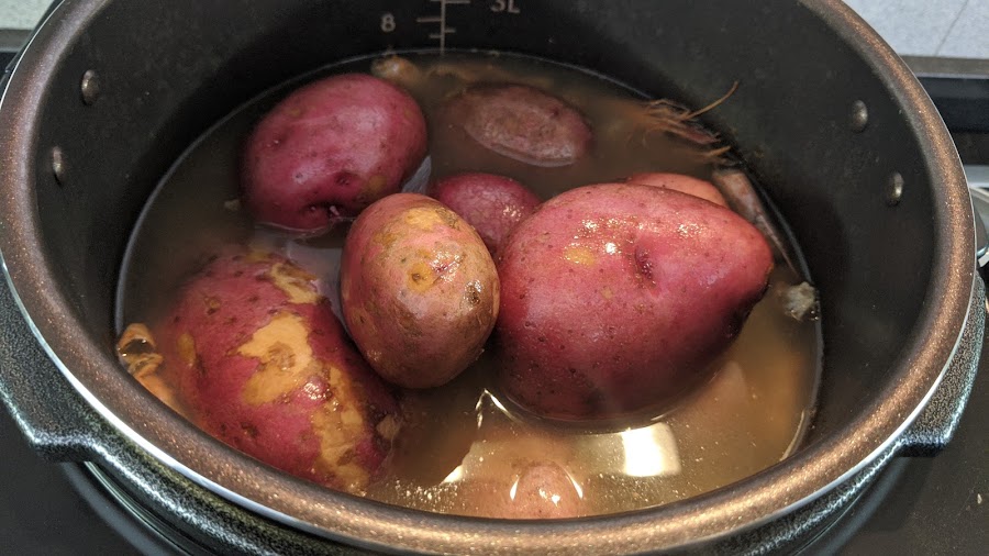 Sacamos las zanahorias y ponemos las patatas sin pelar y bien lavadas. Estas las dejamos 6 minutos y 10 minutos más, sin abrir la olla, después de terminar la cocción