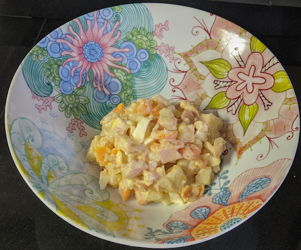 Aunque he cambiado alguna cosilla es en esencia la ensaladilla de gambas de Alberto Chicote, y, aunque ya apetecen pucheros y sopas, es ideal para un aperitivo, con unas tostas recién hechas y como aperitivo de una comida especial