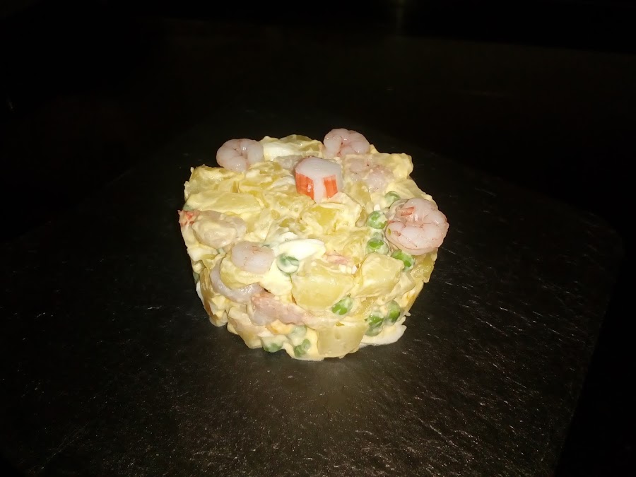 En otra olla, echamos agua con sal y cocemos los guisantes y las gambas. Una vez que tenemos todo cocido. Partimos todo en trozos pequeños, podemos dejar alguna gamba y algún trozo más grande de surimi para decorar. Añadimos mayonesa y sal al gusto y servimos. En este caso he utilizado un aro de emplatar para que la ensaladilla quede más bonita.