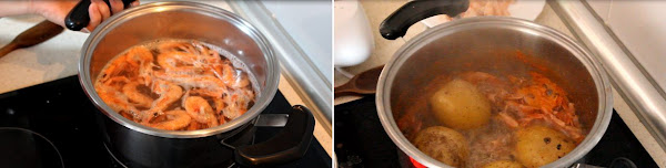 En el agua de cocer las gambas echamos las patatas enteras y sin pelar y las pieles de las gambas. Las cocemos hasta que estén tiernas.