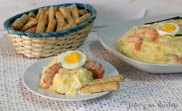 Muy fácil de hacer, con pocos ingredientes y con un sabor delicioso a gambas. Hay tantas versiones de esta ensaladilla como cocineros, pues en cada casa se hace de forma diferente, pero la esencia es la misma, patatas, gambas, huevos y mayonesa y si es casera mucho más rica aún.