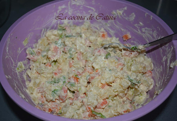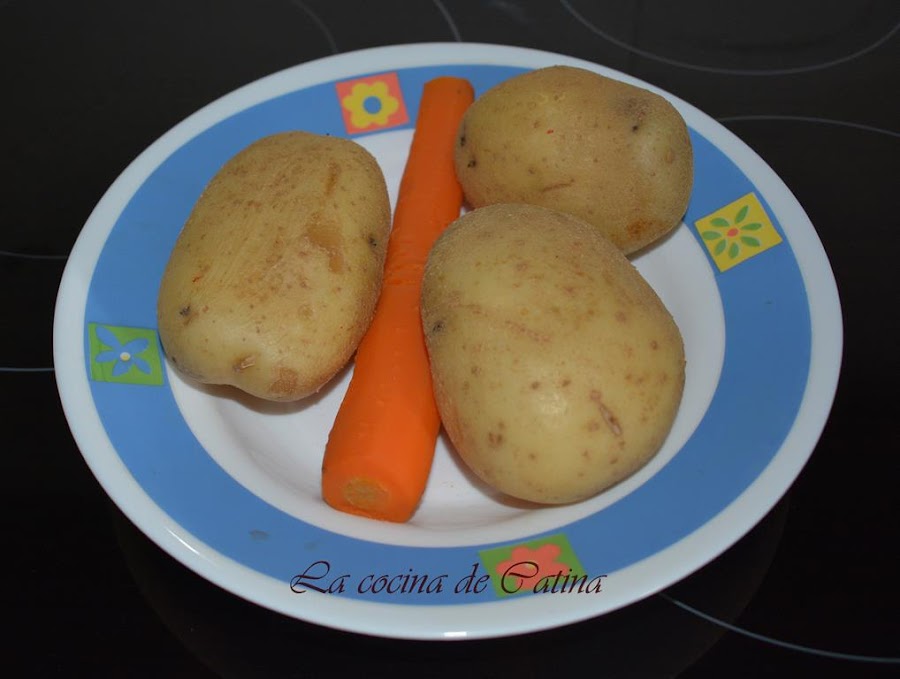 Sacamos del agua, esperamos un poco a que enfríen, las pelamos y las cortamos junto con la zanahoria en cuadraditos pequeños.