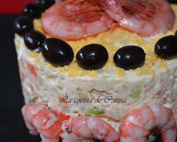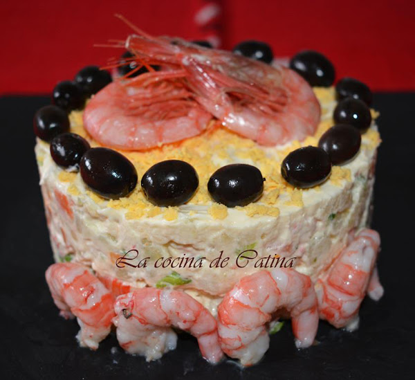 En un bol ponemos el cogollo de lechuga muy picadito, las patatas, la zanahoria y las gambas peladas, añadimos la mahonesa, mezclamos bien y corregimos de sal.