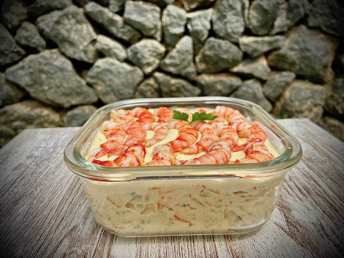 Mezcla la Verdura troceada con Salsa Rosa y algunas Gambitas (puedes partirlas por la mitad si quieres por el lomo)