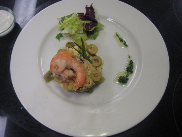 Preparación: Limpiar y trocear las judías y cocer en agua hirviendo con sal durante unos 15-20 minutos, no deben quedar excesivamente cocidas. Cortar la cocción poniéndolas en agua muy fría. En un bol poner las judías verdes bien escurridas, las aceitunas sin hueso, la mitad del huevo duros picado y los langostinos o lo que hayamos elegido. Mezclar bien y reservar. Preparación de la salsa: Mezclar la mayonesa con la cebolla, el zumo de limón, un pellizco de azúcar, sal y pimienta y por último agregar el yogur griego. Mezclar cuidadosamente y colocar en una salsera para servir junto a la ensalada y que cada uno la componga como desee o bien mezclar con la preparación de las judías,, eso depende de lo que queramos. Yo lo suelo poner aparte. Poner en cada plato un lecho de ensalada variada y sobre éste la ensaladilla de judías verdes y langostinos. Adornar con un poco del huevo reservado, alguna aceituna y algún langostino o elemento empleado. Podemos presentarla también en forma de brochetas, en vasitos. Nos da mucho juego y podemos cambiar ingredientes a nuestro gusto/necesidad.