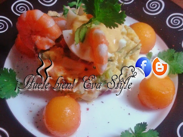 1.- Colocamos un aro de despostaría en el centro de un plato, lo rellenamos. Ponemos sobre la ensaladilla la corona de huevo rellena con la salsa. Colocamos a ambos lados un langostino. Decoramos con una ramita de perejil. Colocamos las cuatro bolas de papaya, que hemos extraído de la fruta con una cuchara parisina ( un saca bolas). La ponemos alrededor de la ensaladilla, decoramos el plato con unas hojas de perejil y rociamos con una pizca de pimienta molida. Podemos servir inmediatamente o guardar 30 minutos en la nevera antes de servirla.