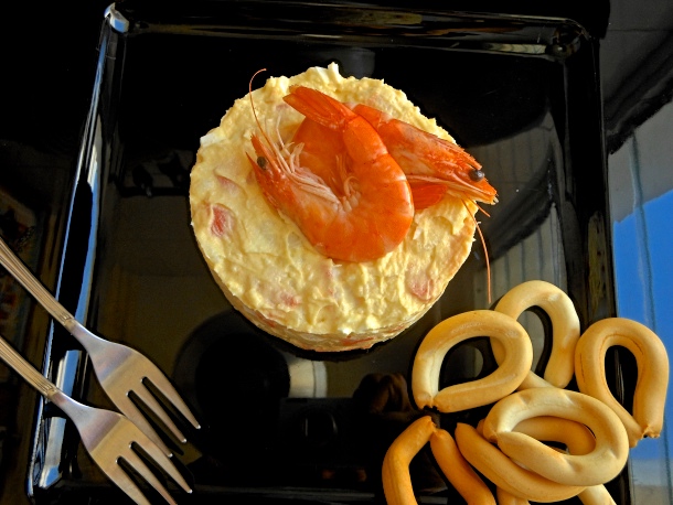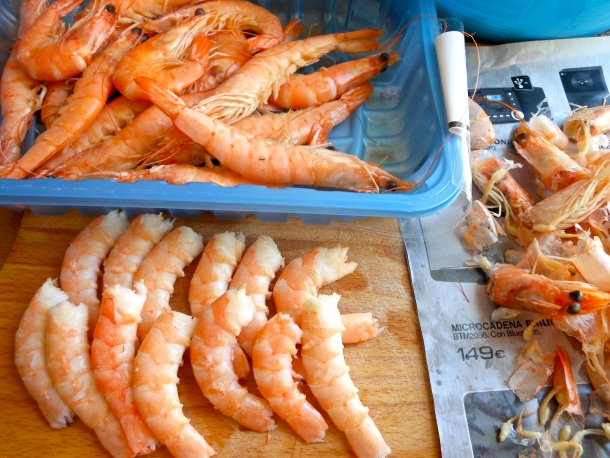 Seguidamente quita la cabeza y la piel de los langostinos reservando alguno sin pelar para la decoración del plato; tras esto pícalos en tres o cuatro trozos.