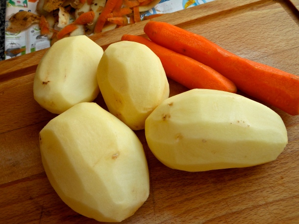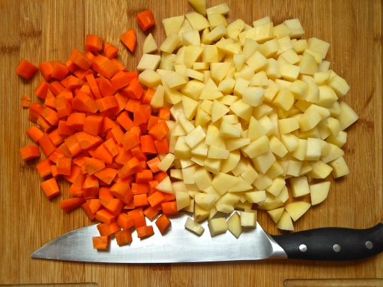 Seguidamente pela y pica las patatas y las zanahorias en dados.