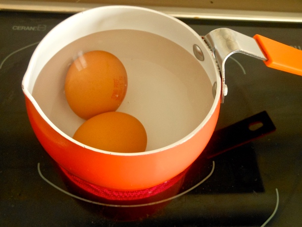 Lo primero que vamos a hacer es poner los huevos en un cazo cubierto de agua, tras esto, déjalos cocer durante 12 minutos contando a partir de que el agua comience a hervir.