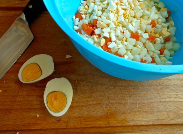 Mientras tanto, pica los huevos y la cebolleta en en dados pequeños.