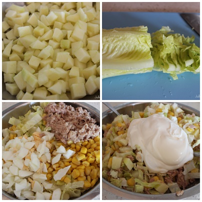 Mezclamos la manzana con la lechuga, los huevos troceados, el maíz escurrido y el atún. Lo mezclamos todo bien y añadimos la mayonesa. Seguimos mezclando hasta que todo esté bien integrado.