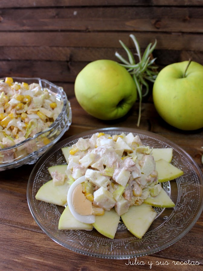 Me gustan los dos, pero en esta ocasión he decidido utilizar la manzana para hacer esta rica ensaladilla de manzana. Es como si fuera una ensaladilla rusa, pero en vez de patatas utilizo manzana, queda mas ligera y el contraste del dulce de la manzana con el salado de los demás ingredientes queda ideal.