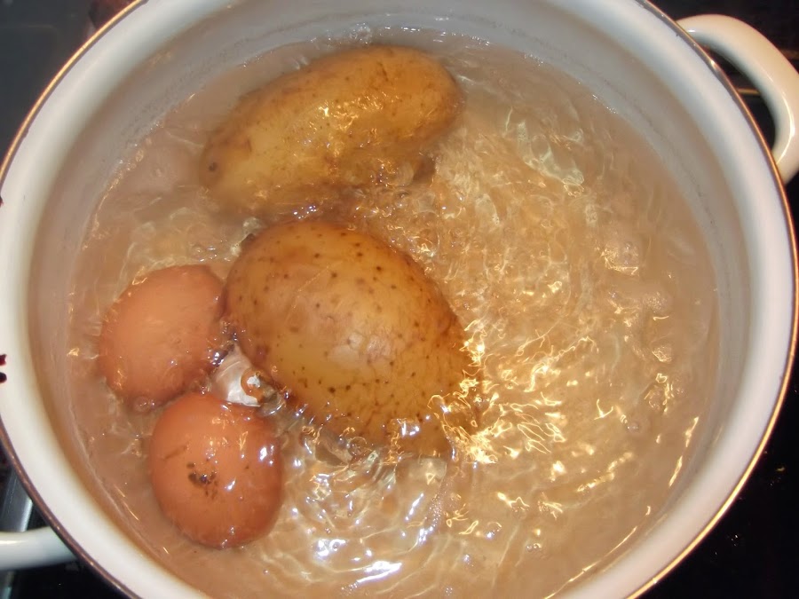 Lo primero que hacemos es poner a cocer las patatas en agua hirviendo con un poco de sal, en función del tamaño de las patatas tardarán más o menos tiempo en cocerse. Para saber si están cocidas, las pincháis con un cuchillo y si sale con facilidad es que ya están listas, cuando veáis que le quedan diez minutos a las patatas ponéis los huevos a cocer.