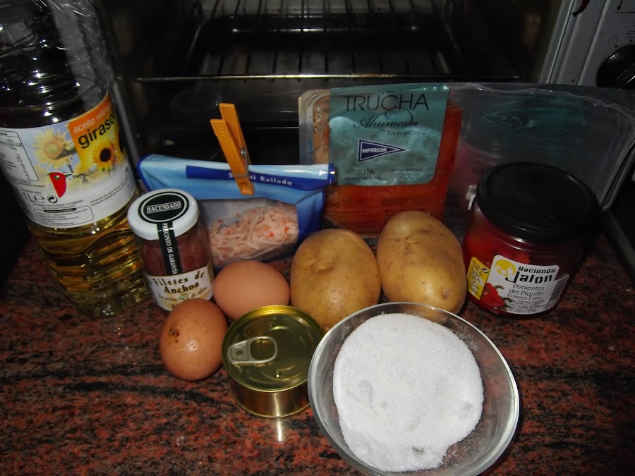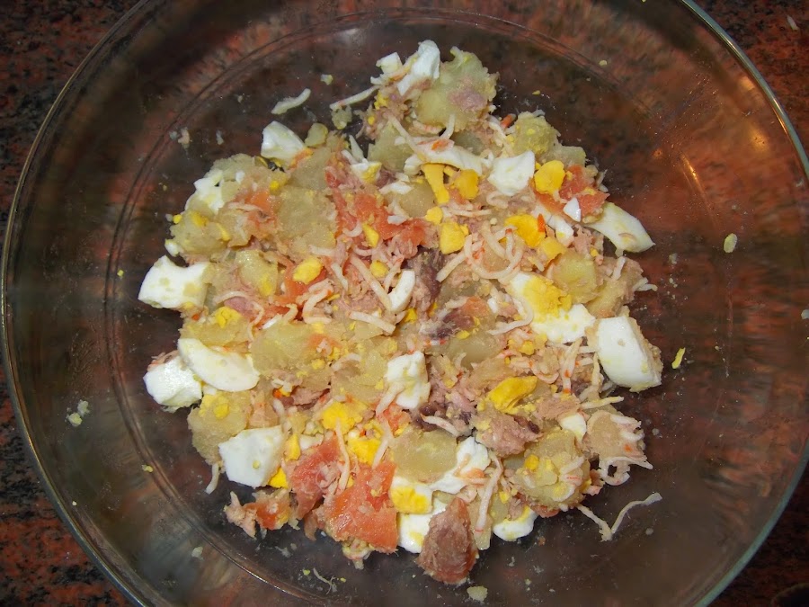 Ahora comenzamos a montar nuestra ensaladilla, cuando se han enfriado las patatas y los huevos, los pelamos, los cortamos en trozos y los echamos a una ensaladera, echamos la lata de atún escurrida, el surimi, la trucha ahumada partida en varios trozos y las anchoas guardando unas cuantas para adornar. Una vez que ya tenéis todos los ingredientes le dais varias vueltas y vais añadiendo parte de la mayonesa.