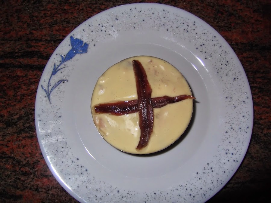 Finalmente, sólo queda montarla, en este caso he utilizado un aro para emplatar y quede más bonita, se echa la ensaladilla y en la capa de arriba se pone unas cuantas cucharadas de mayonesa y para decorar un par de anchoas, también le podéis añadir algún pimiento del piquillo, aunque como en este caso la iba a presentar a un concurso en el que el ingrediente principal es la anchoa preferí dejarlas solas para darles mayor protagonismo. Y ya está el plato listo para degustar.