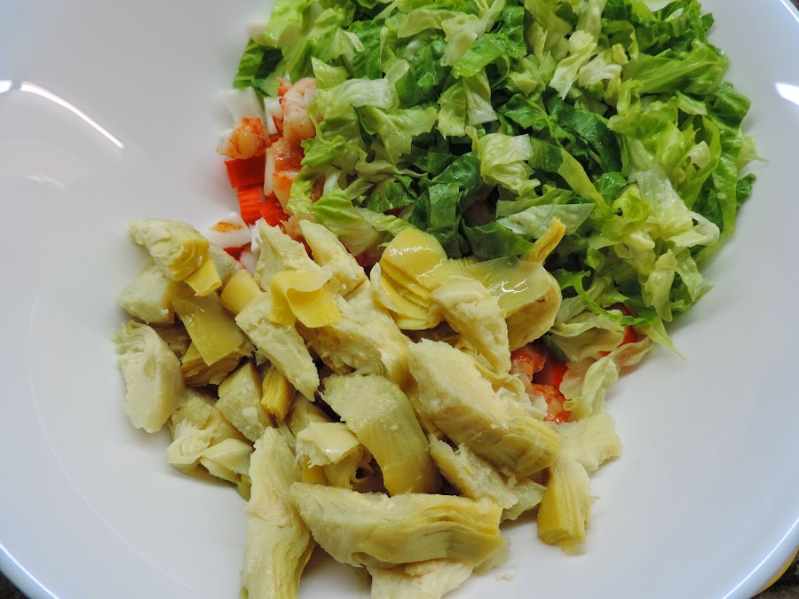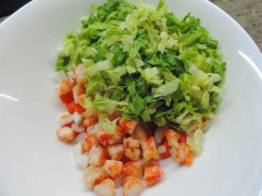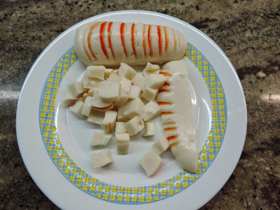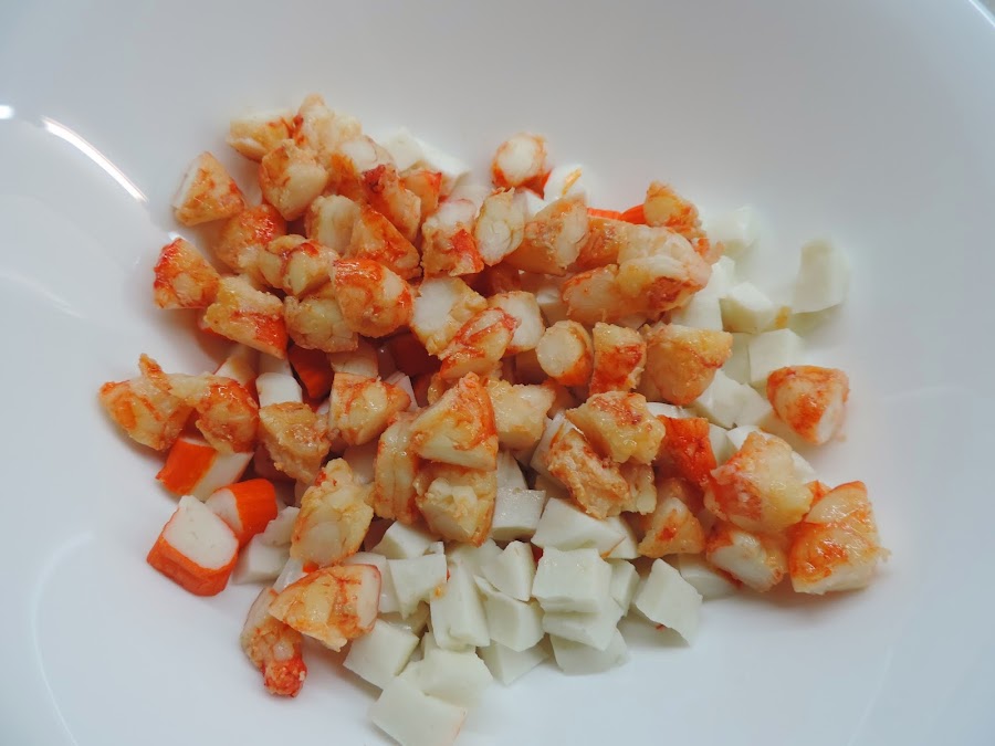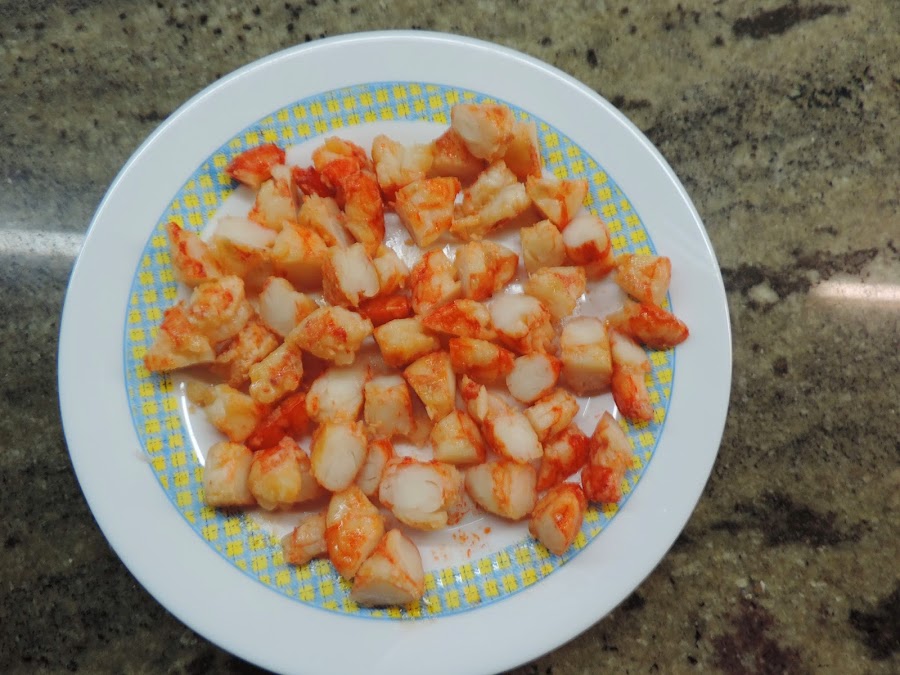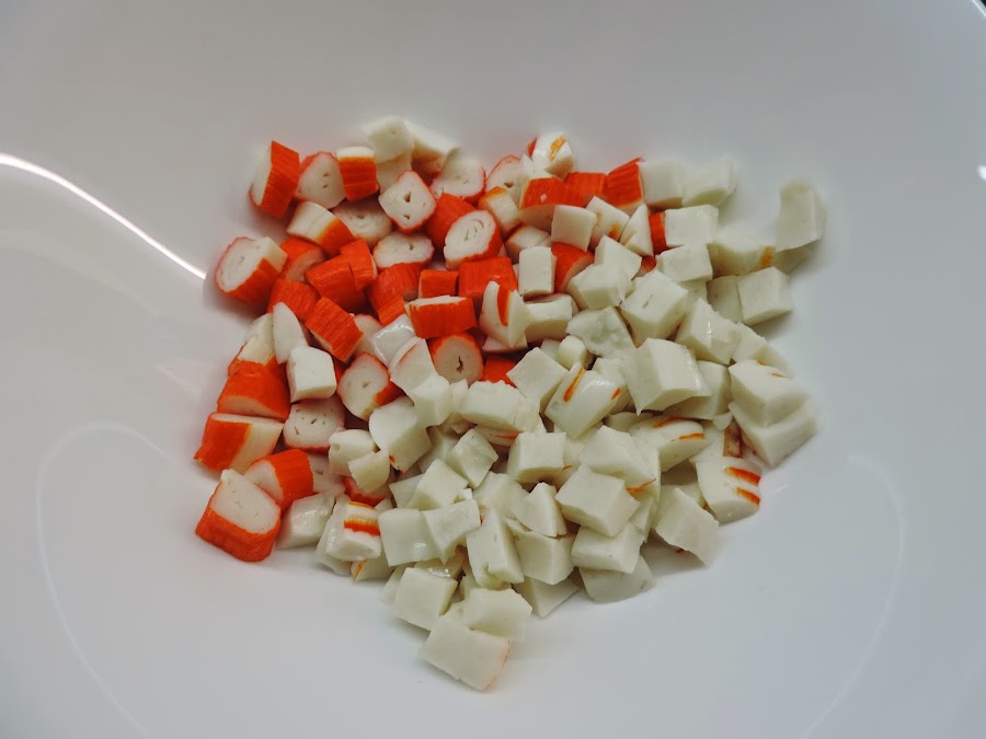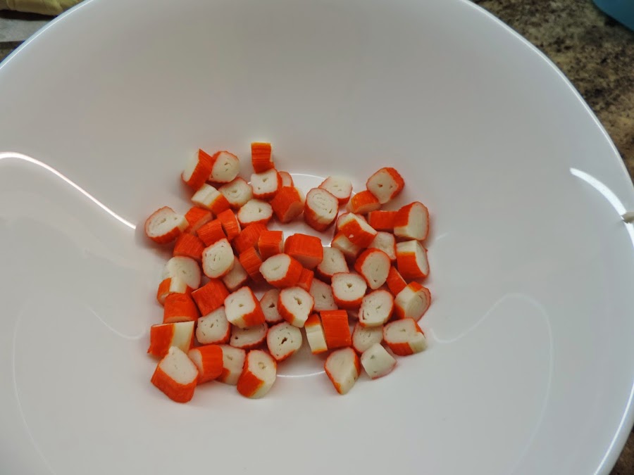 Cortamos los palitos de surimi en trozos y los ponemos en un bol.