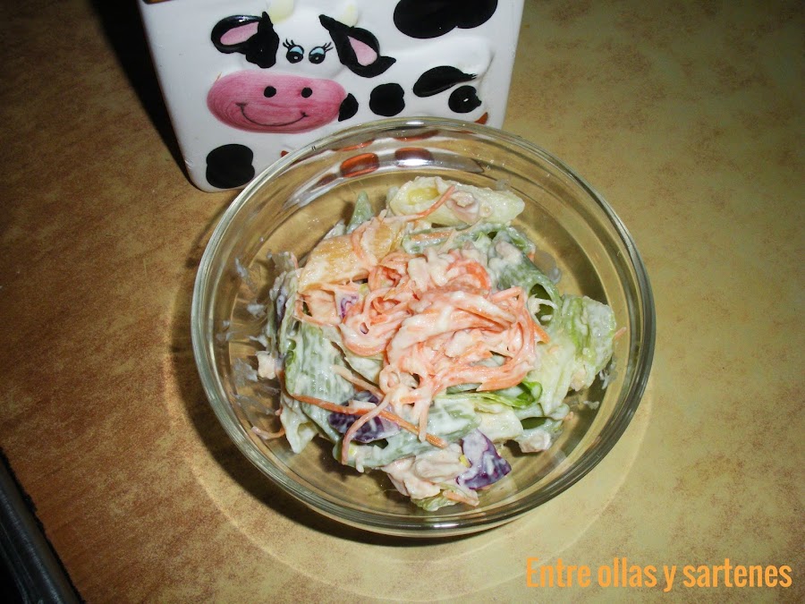 Cuando ya este fría, mezclamos la pasta con la ensalada, el maíz y el atún desmigado. Salamos y vamos poniendo mahonesa a la vez que mezclamos.