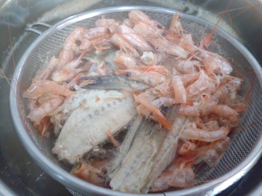 Mientras, en una cacerola echar el agua y ponerla en el fuego con un poco de sal, colocar un colador grande y en él poner las espinas del pescado, las cabezas y la piel de las gambas. Llevar a ebullición y dejar cocer durante unos minutos.