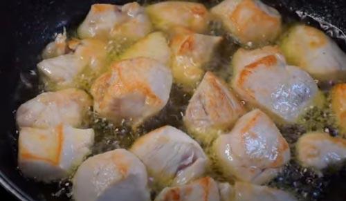 Luego, en una sartén aparte ponemos el aceite de oliva y cuando esté caliente vamos a ir echando los trozos de pollo y los tendremos unos 3 minutos por cada lado a fuego fuerte.