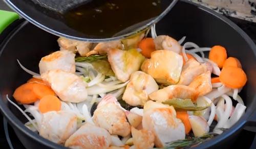 A continuación, sacamos el pollo en un plato y lo añadimos a la cazuela dónde tenemos todos los ingredientes, añadimos también el aceite en el que hemos dorado el pollo.