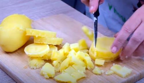 Una vez que ya tenemos las patatas cocidas y han enfriado un poco para poder manipularlas, las pelamos y cortamos en trozos pequeños.