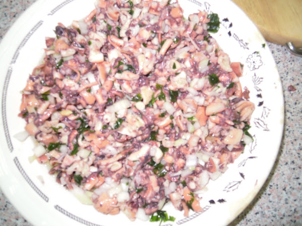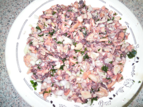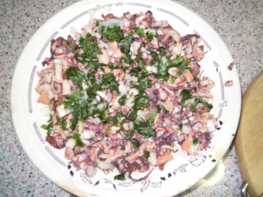 Una vez picado lo disponemos en una fuente. Picamos la cebolla y el perejil. Lo añadimos al pulpo.