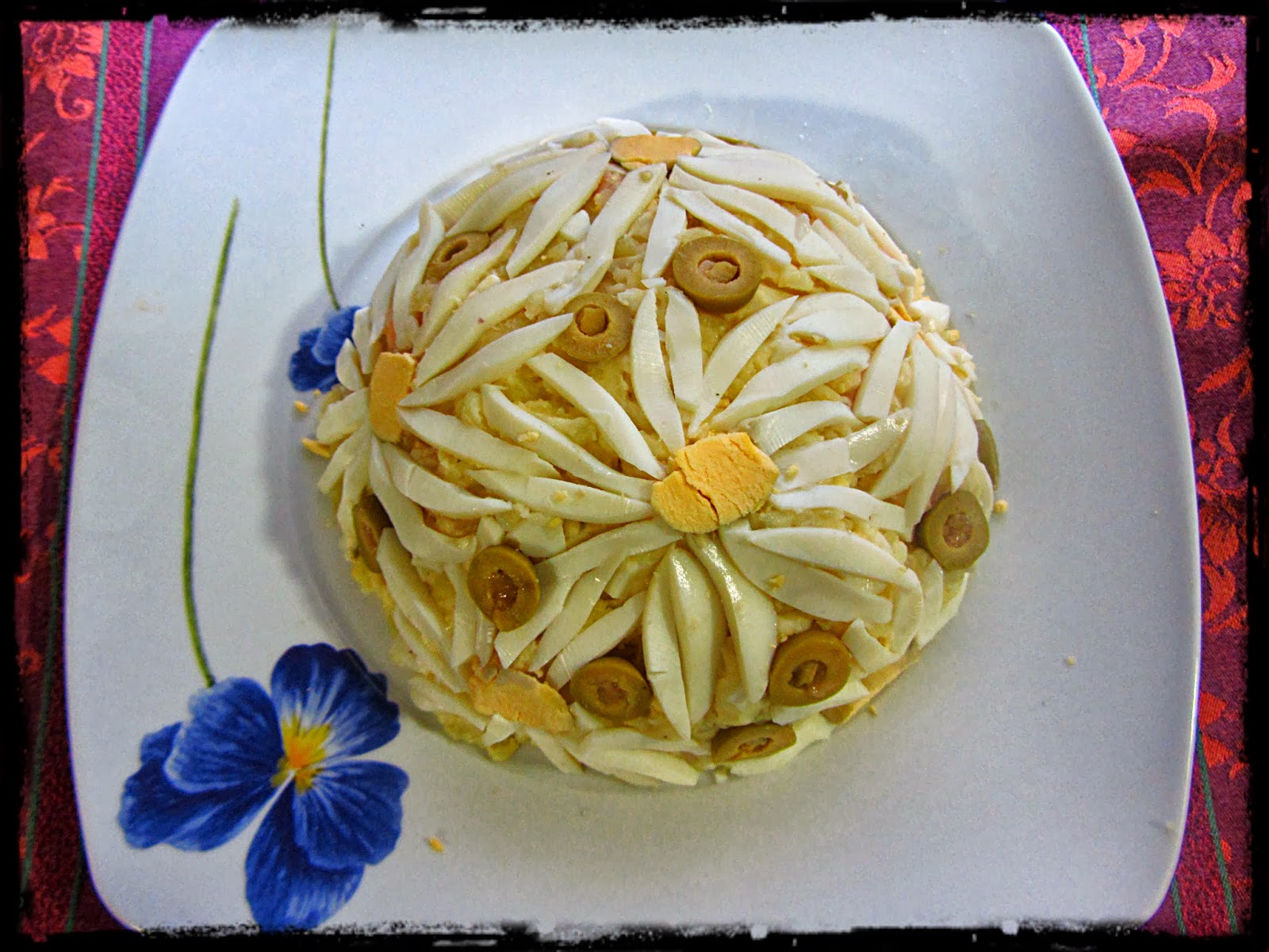 Rectificamos un poco la forma si fuera necesario, y vamos decorando, formando margaritas con la clara y la yema de los huevos (para facilitar las cosas, es mejor abrir los huevos a lo largo, sacar la yema entera, e ir cortando los "pétalos" y los centros). Cubrimos toda la superficie de la ensalada con las flores, e intercalamos rodajitas de aceituna, para darle un toquecito "verde".
