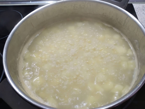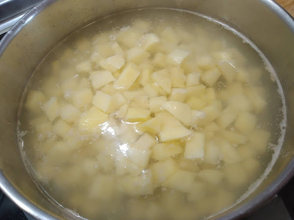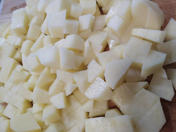 Pelar las patatas, cortar en cuadrados no demasiado pequeños y reservar.