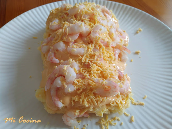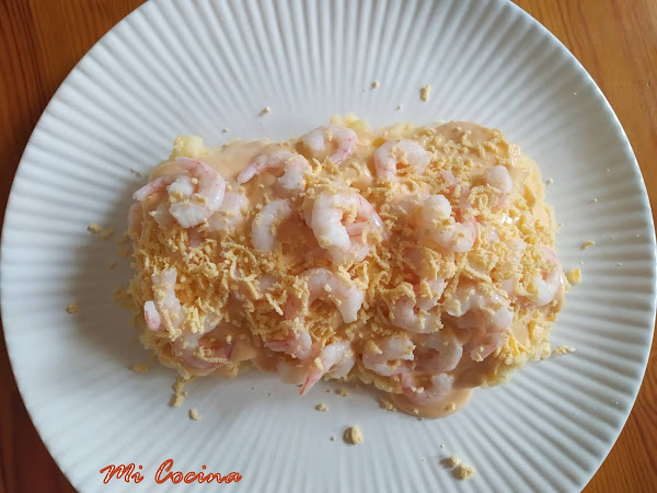 incorporar sobre ella las quisquillas y rallar en toda la superficie la yema de huevo.