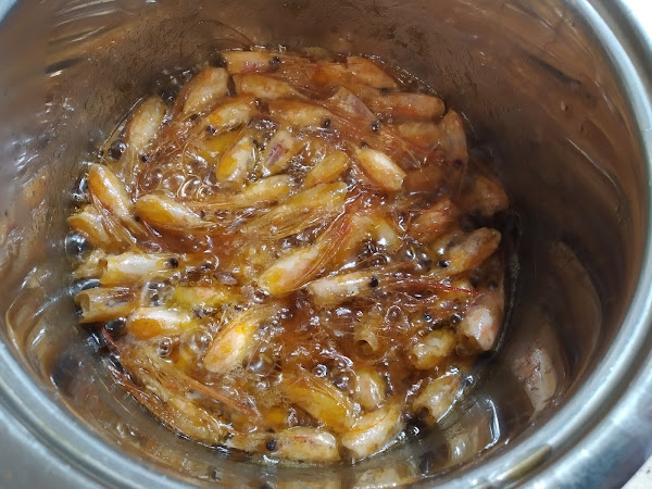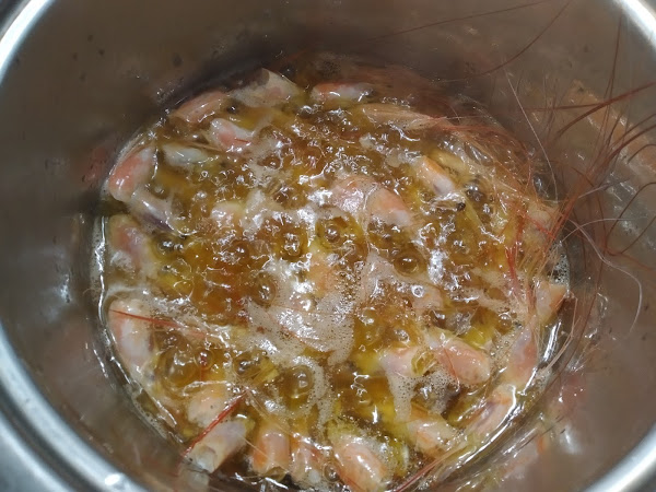 En una cacerola echar un vaso grande de aceite de oliva virgen extra, poner a fuego medio e incorporar las cabezas de las quisquillas e ir confitándolas, removiendo de vez en cuando aproximadamente una media hora, hasta conseguir que éstas estén doradas y se haya conseguido que el aceite de oliva tome igualmente un color más oscuro.