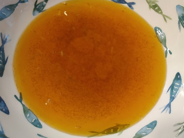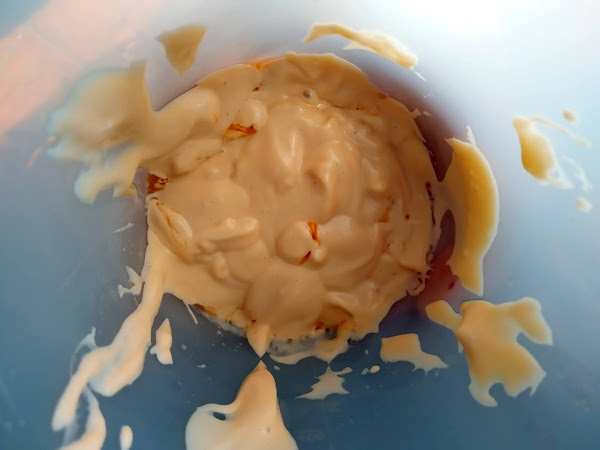 Mientras hacer la mayonesa. Para ello, echar un huevo en la batidora y sobre él el aceite (ya frio) de haber confitado las cabezas de las quisquillas, salando al gusto. Dar a máxima potencia hasta conseguir que espese y la mayonesa esté en su punto.