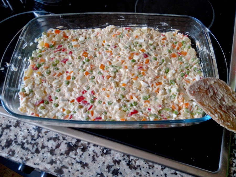 4. En una ensaladera mezclamos las patatas con las zanahorias y los guisantes echamos un chorrito de aceite, añadimos los pepinillos y las aceitunas picadas, los pimientos, y los huevos, ahora el atún, salpimentamos. Añadimos mayonesa al gusto y mezclamos todo bien.