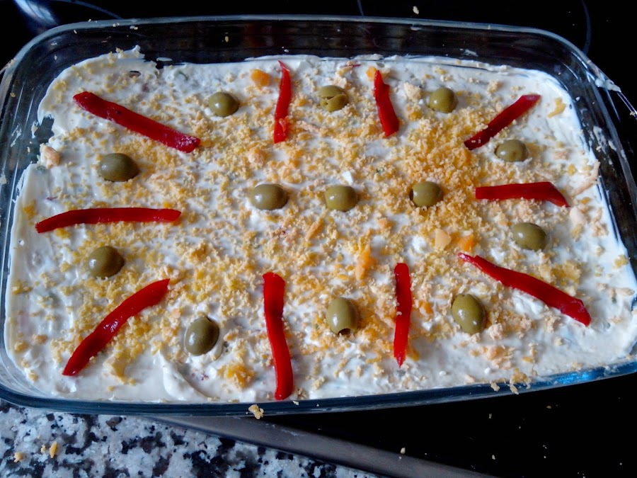 Para presentar cubrimos la ensaladilla con una capa de mayonesa, rallamos las dos yemas reservadas por encima y repartimos unas tiras de pimiento y aceitunas y LISTO!!!