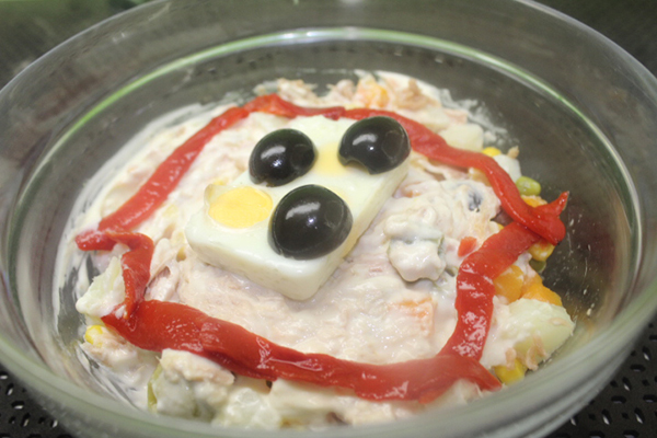 Repartimos la ensaladilla entre dos recipientes, añadimos las aceitunas (reservando tres de ellas para decorar), los pepinillos, el maíz y el atún.