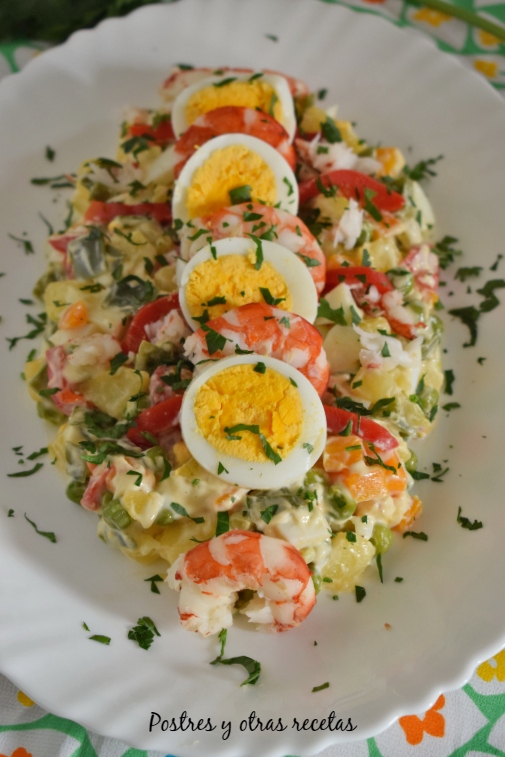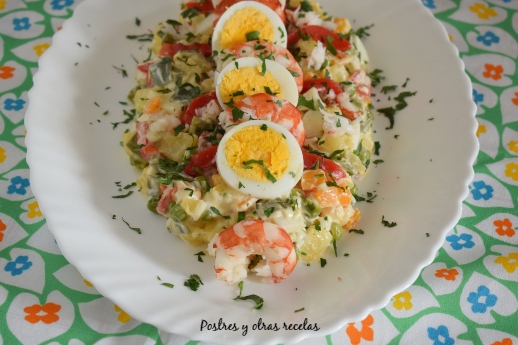 Hemos elaborado un plato muy veraniego pero variándolo un poco al añadirle langostinos y pimiento morrón.