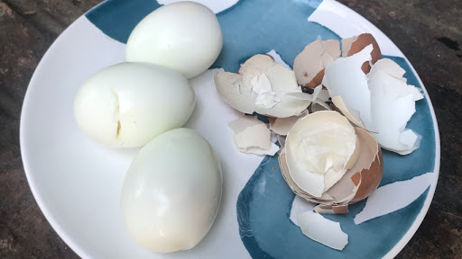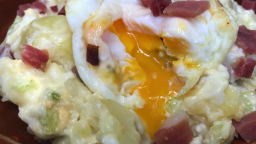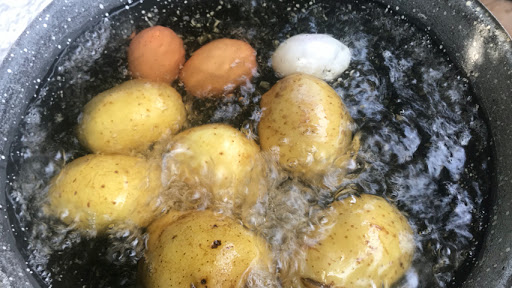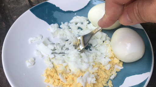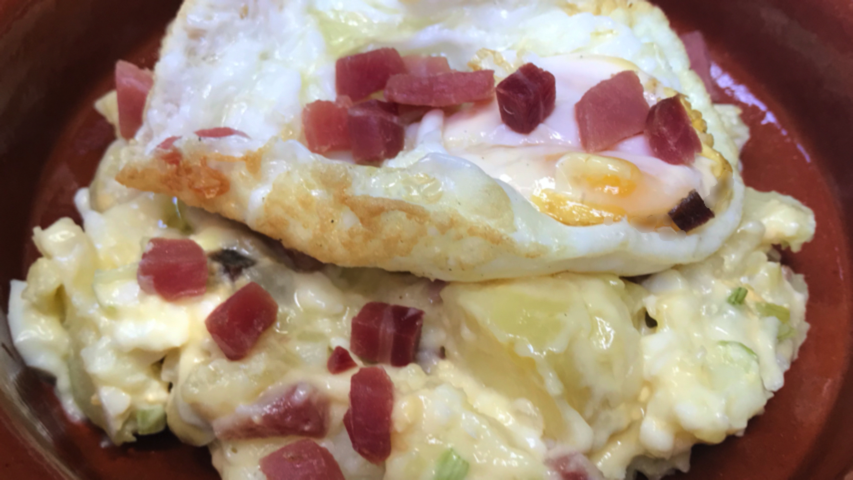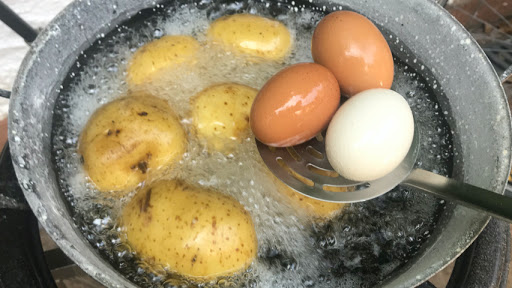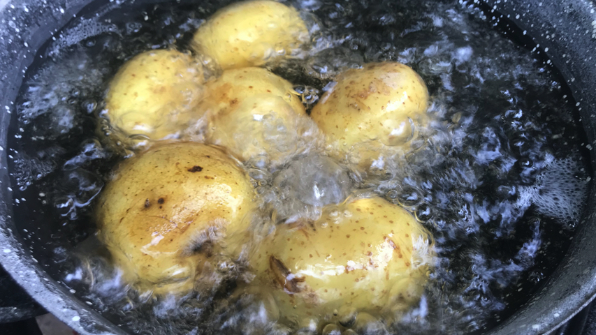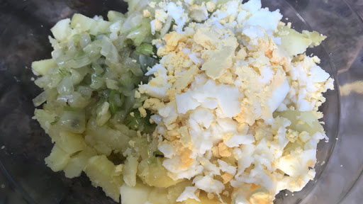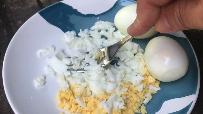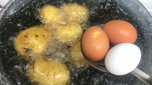 Cuece los huevos en la misma agua que las patatas (con mucha sal) durante 10 minutos. Enfría y pela los huevos. Pícalos. Reserva.