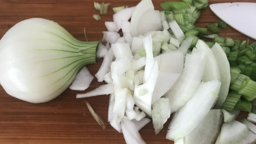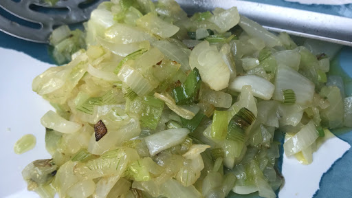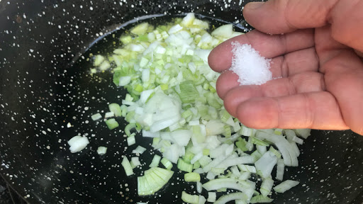 Prepara una sartén a fuego medio alto con un poco de aceite de oliva y sofríe la cebolleta sazonada hasta que esté bien hecha. Resérvala.