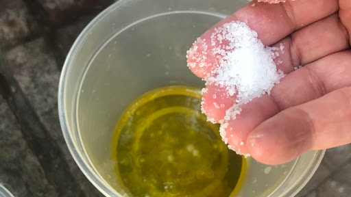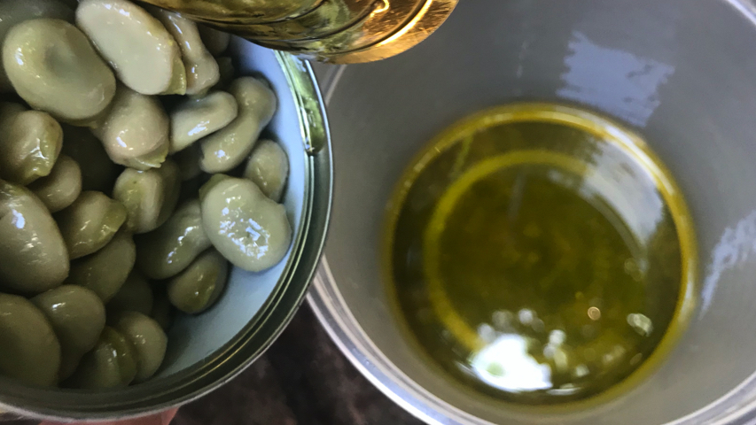 Abre la lata de habas en aceite y cuela el contenido. Reserva las habas y pon el aceite en un vaso de la trituradora. Lo usaremos para hacer una mayonesa.