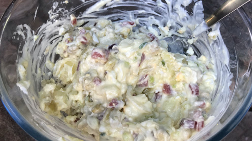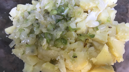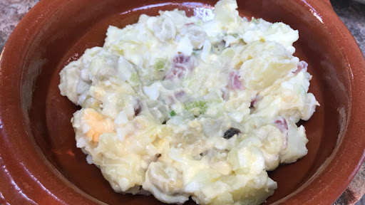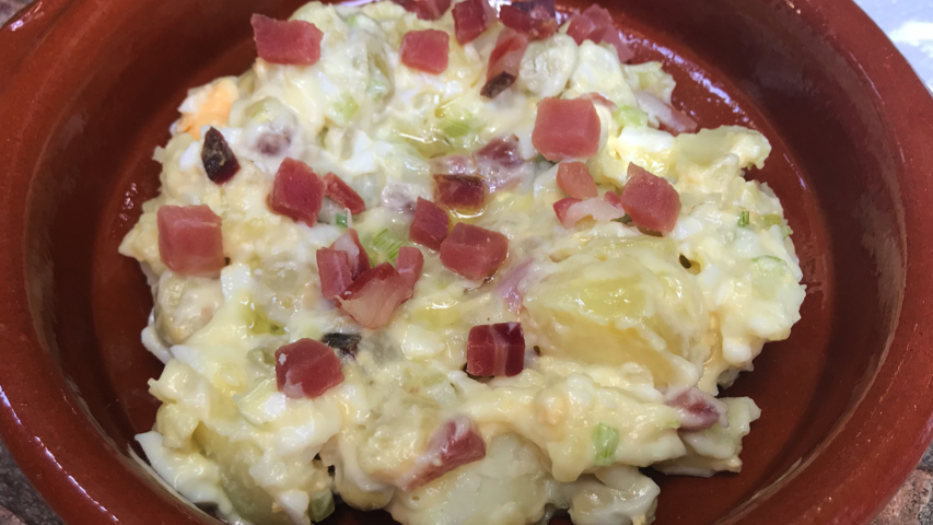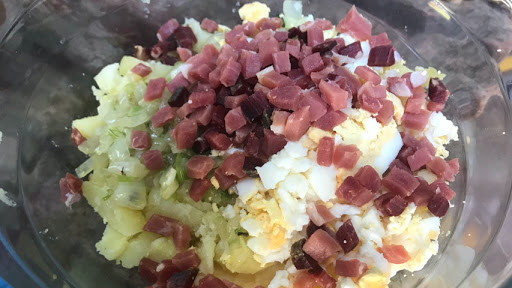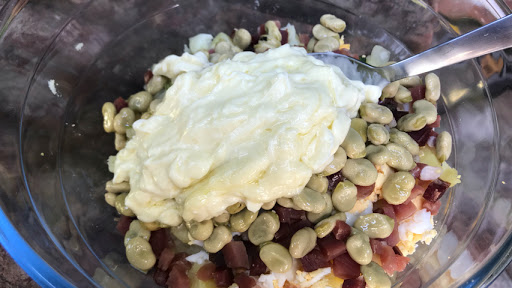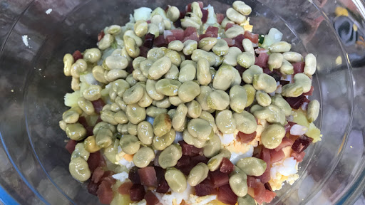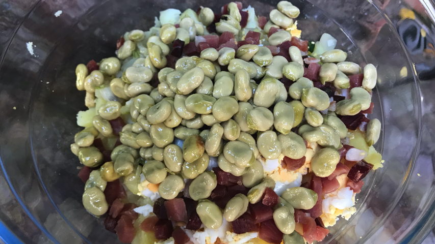 En un bol pon las patatas cortadas menudas, las habas, la cebolleta sofrita, el jamón picado menudo y la mayonesa. Mézclalo todo bien.