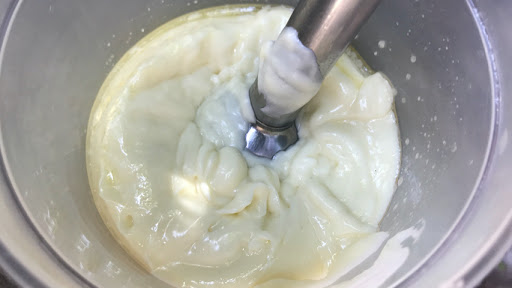 Pon un huevo en el vaso de la trituradora, zumo de limón, sal y si lo crees necesario añade algo más de aceite de girasol. Tritura hasta que monte la mayonesa. ajusta de sal. Reserva.